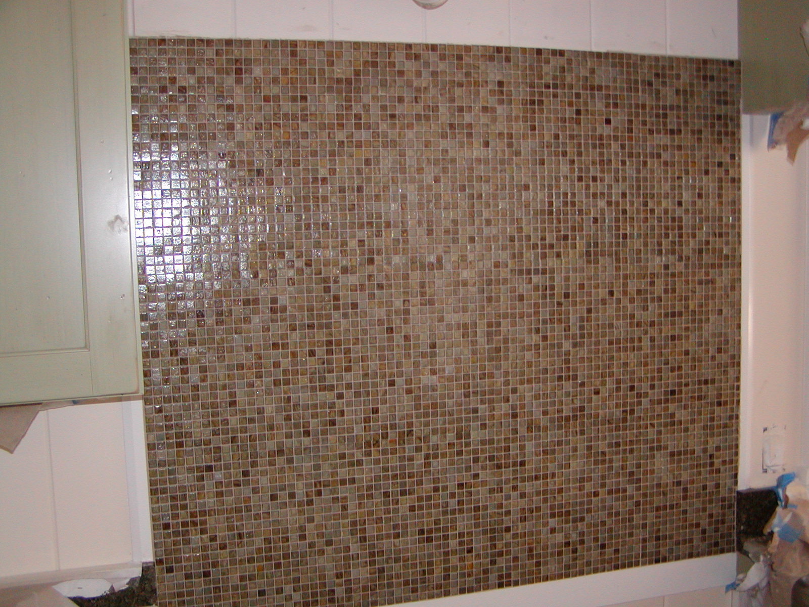 June 3, 2008 -- The range backsplash is in place. It is made of glass tile with an epoxy grout. The hood will be installed above the tile. | ![]() |