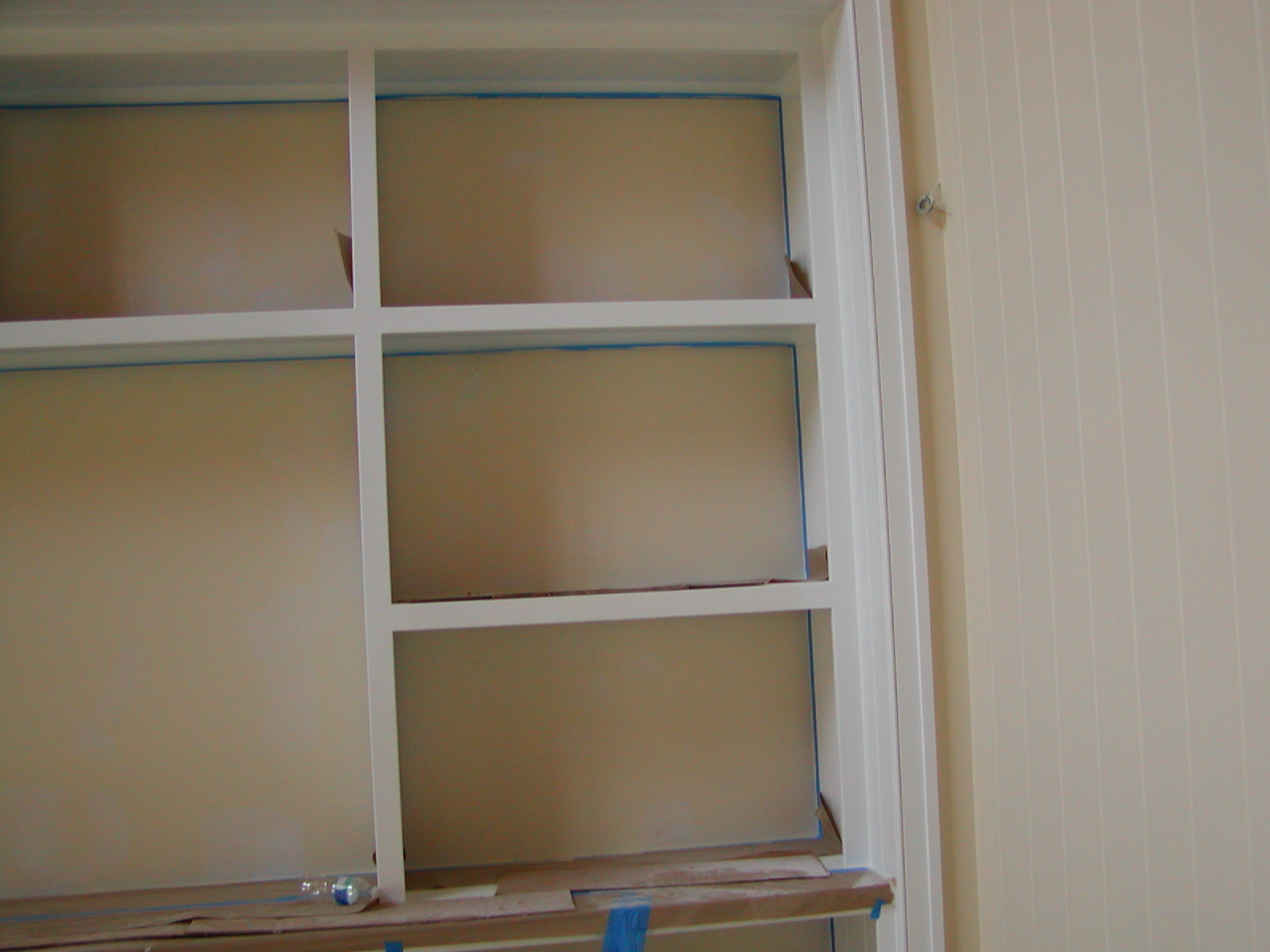 June 3, 2008 -- The living room built in is painted white like the wood trim. The back of the book case is painted antique white like the walls. | ![]() |
