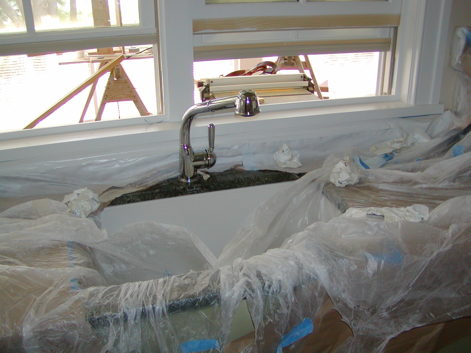 June 3, 2008 -- The faucets are being installed today. This is the kitchen sink and faucet. Plastic masking will be removed in a day or two. | ![]() |