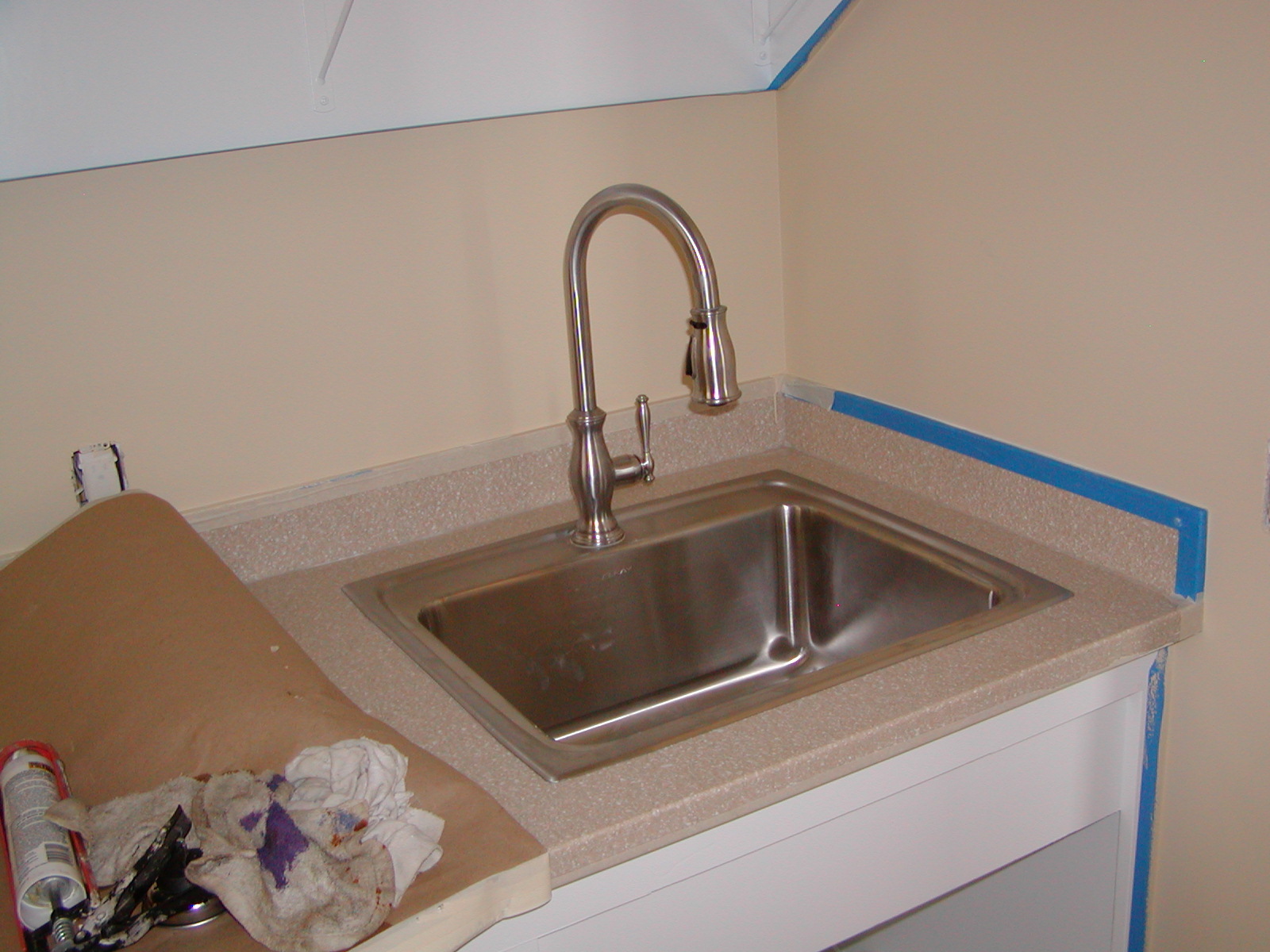 June 3, 2008 -- The laundry room sink and faucet are installed. It has a Corian top. The blue tape is for masking and will be removed in a day or two. | ![]() |