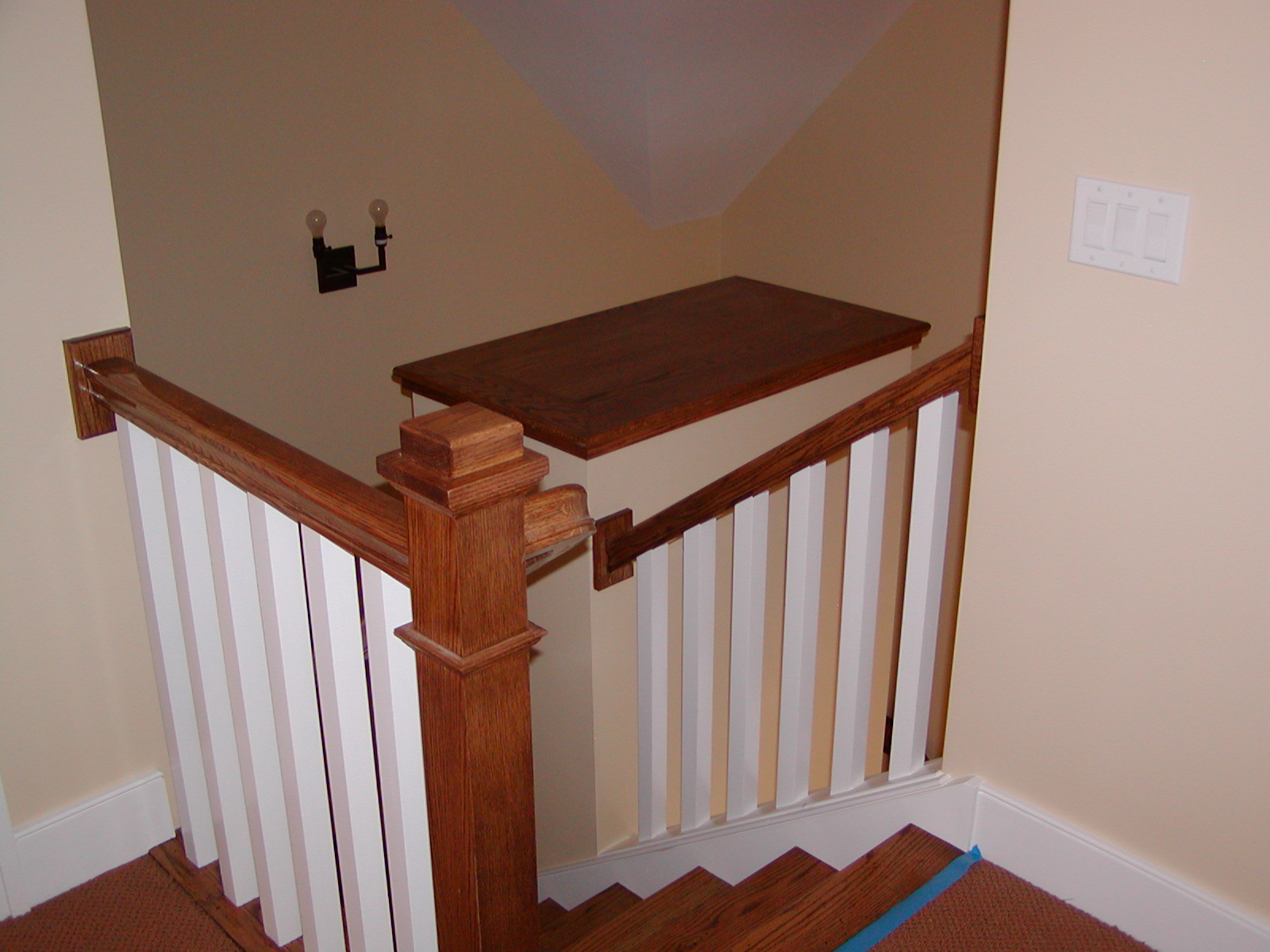 June 16, 2008 -- The plant shelf oak top was also given a final coat of poly. The blue tape in the lower right is masking tape. | ![]() |