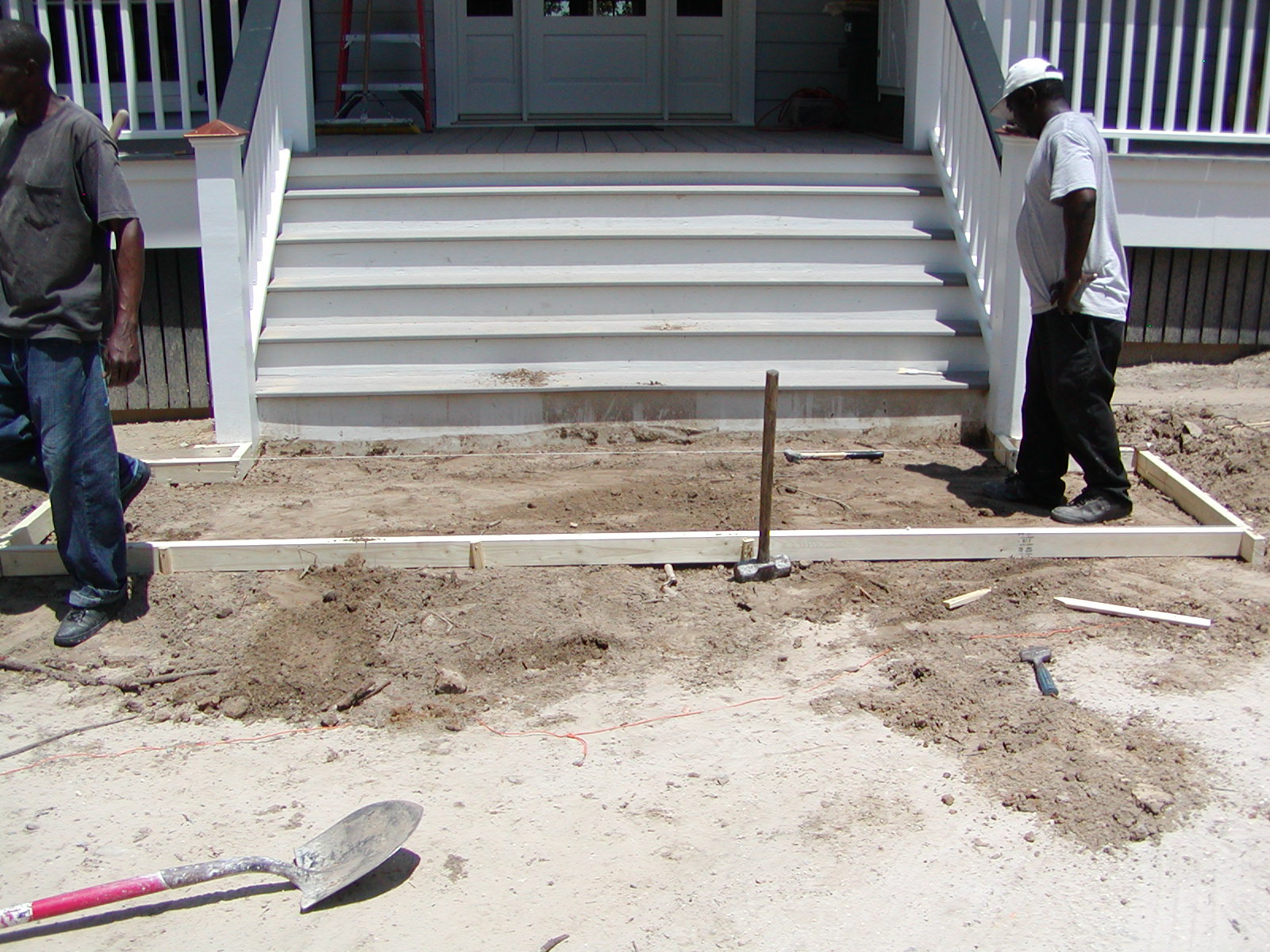 July 1, 2008 -- The rear (drive side) steps also get an oyster shell pad with a brick border. | ![]() |